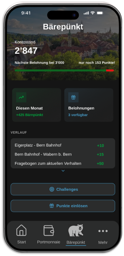 Hier setzen wir mit Bärepünkt an. Die Idee entstand aus der Beobachtung, dass die Nutzung des öV zwar nachhaltig und kostengünstig ist, aber selten mit einem direkten Belohnungsgefühl verknüpft wird. Bärepünkt schafft genau diesen Mehrwert. Ein spielerisches Bonusprogramm, das Fahrten automatisch erkennt, CO₂-Einsparungen sichtbar macht und den öV durch konkrete Vorteile im Alltag attraktiver gestaltet, vom Kaffee unterwegs bis zu vergünstigten Eintritten in Museen.